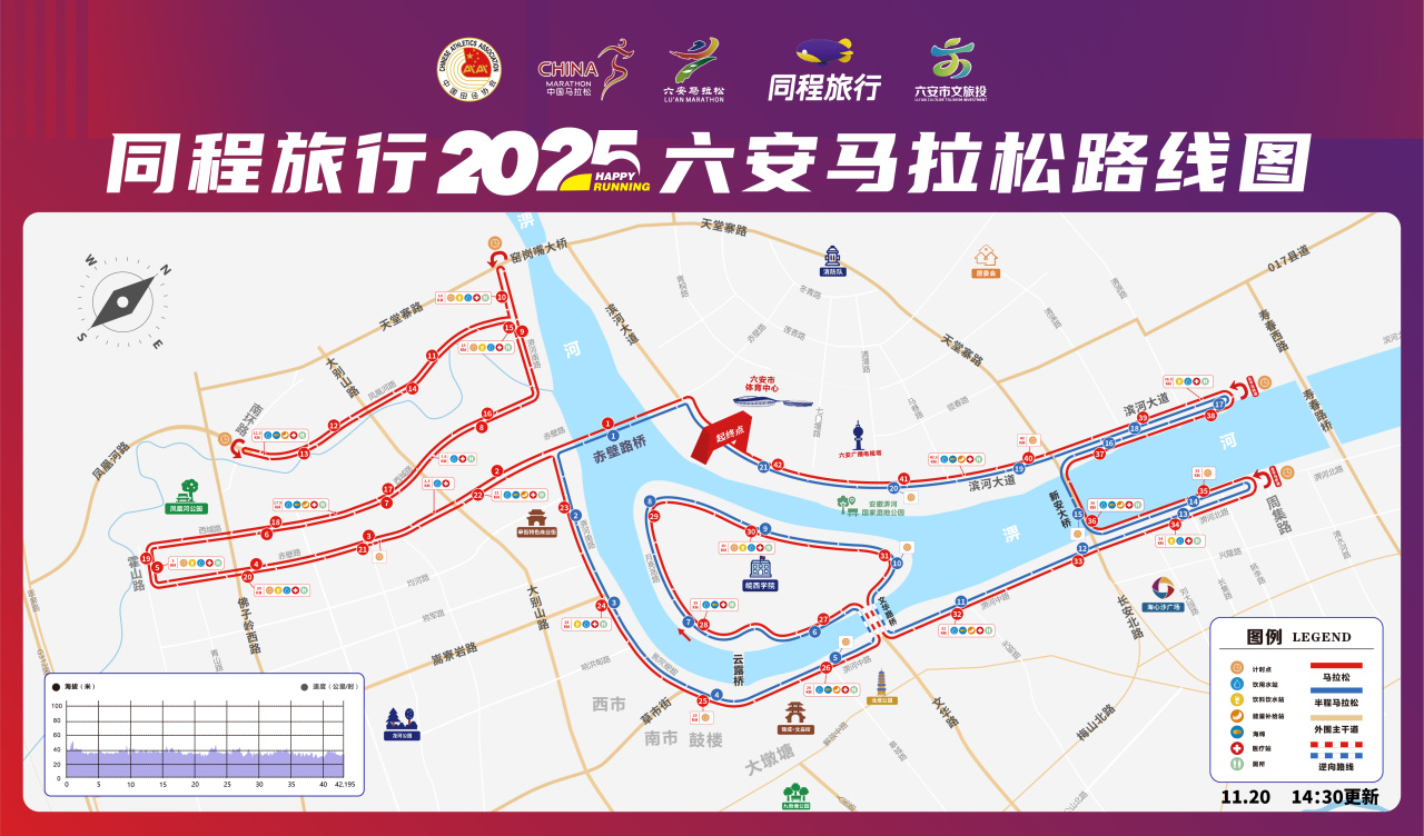 (二)半程马拉松(21.0975公里):六安市体育中心南门(起点)→赤壁路桥→淠河南路→文华路桥→月亮岛路→文华路桥→淠河中路→淠河北路(折返)→淠河北路→新安大桥→滨河大道(折返)→滨河大道→六安市体育中心南门(终点)